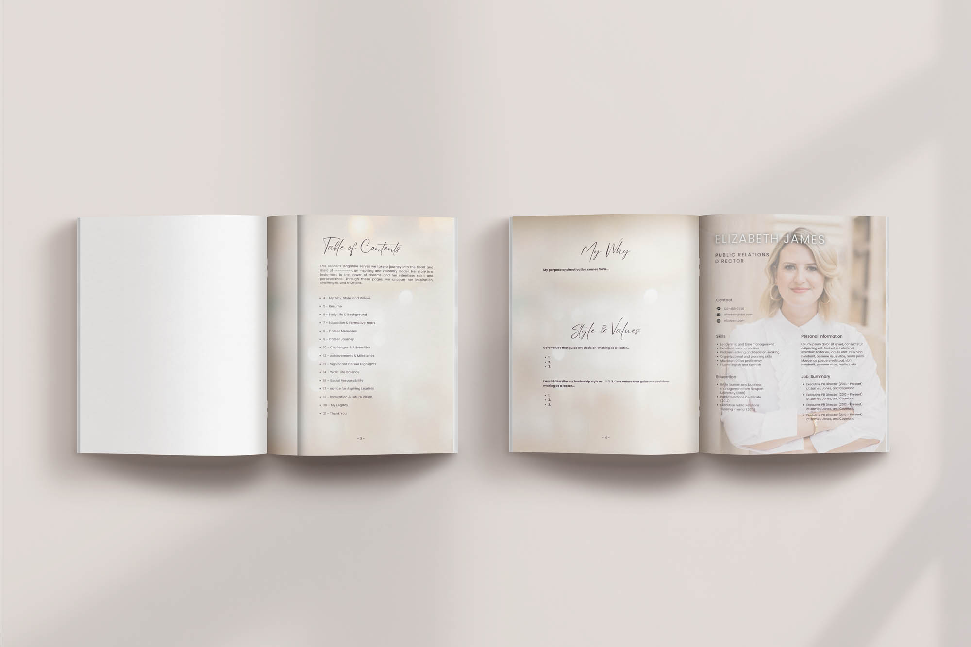 This magazine is the ideal platform for leaders from all walks of life, including non-profits, community organizations, churches, and beyond. It offers you a space to chronicle your pioneering path, sharing your narrative to motivate your followers. This 24-page template captures your background, education, and career progression, along with your driving forces; detailing how these experiences have molded you into the accomplished leader you are today. Through our guiding questions, you’ll have the means to vividly recount your story within a tastefully crafted magazine, designed for both digital and print formats. For more information, click here.
